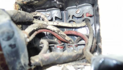 Old cloth insulation damaged due to high temperature. This receptacle was used to plug in space heater.